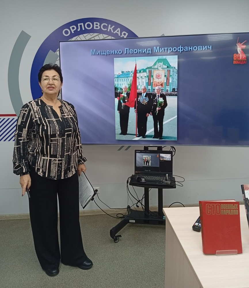 Библиотекарь Ирина Анатольевна Мищенко рассказала ребятам о своем родственнике Леониде Митрофановиче Мищенко, который участвовал в параде Победы 24 мая 1945 года. А затем в 1995 г. и в 2000г. он был приглашен на парады 9 Мая в Москву, и в качестве почетного гостя сидел на трибуне.