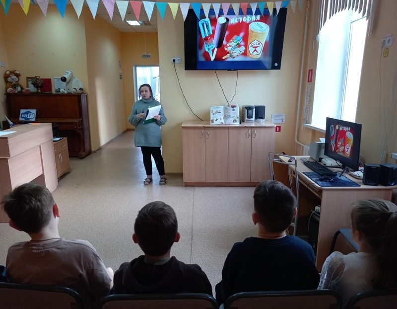 Встреча началась с небольшого путешествия в историю этого удивительного лакомства, ведь мороженое было не всегда. Библиотекарь рассказала юным читателям о том, каким было мороженое в древние времена, откуда оно пришло в Европу, а затем в другие страны. Дети узнали почему эскимо называется «эскимо», как делали мороженое в далёком прошлом, когда не было холодильников, и как производится мороженое и, эскимо, в том числе, сейчас.