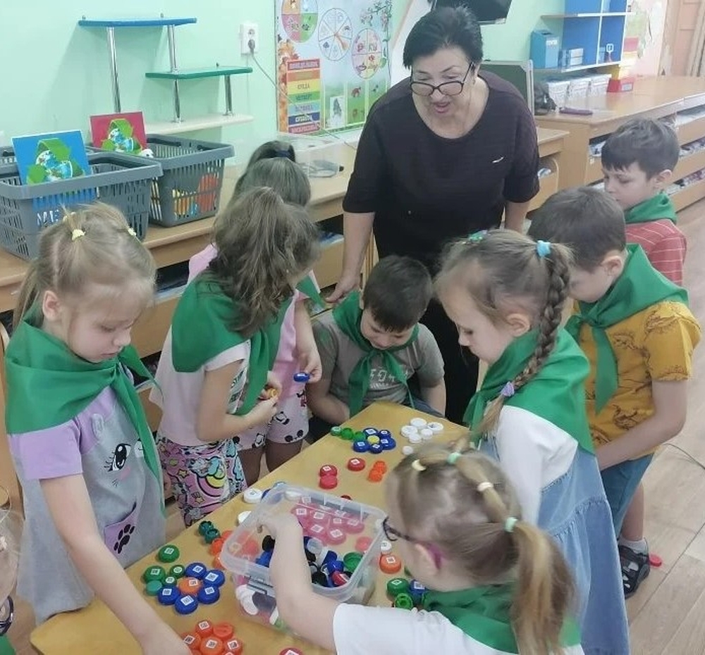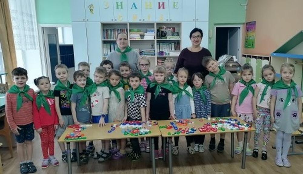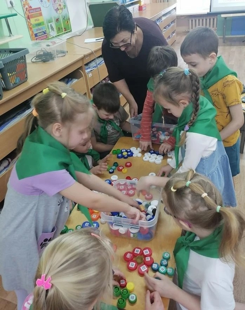 И, конечно же, не обошлось без игр. Дошколята правильно рассортировали мусор, а из разноцветных пластмассовых крышечек сделали цветочное царство.