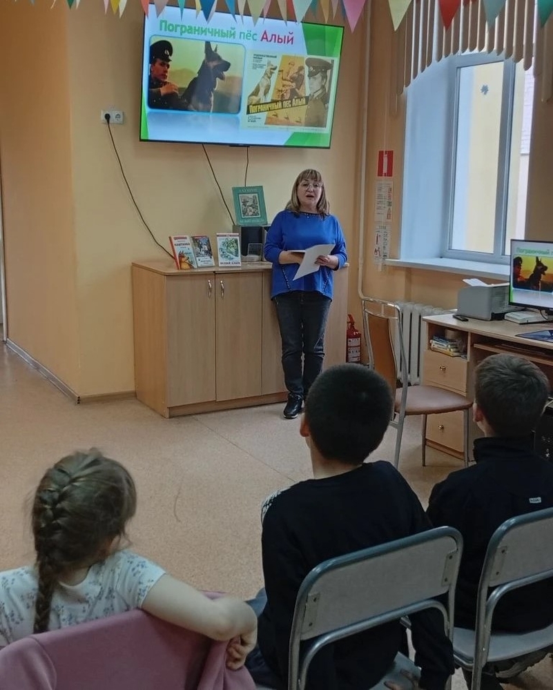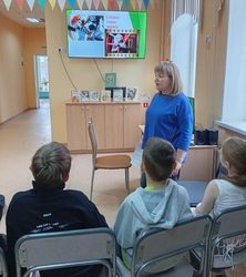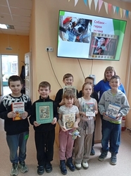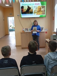 Библиотекарь рассказала ребятам о фильмах, в ктоторых можно увидеть собак-актеров. А затем провела обзор книжной выставки, где были представлены книги из фонда Гайдаровки, по которым были сняты художественные фильмы.